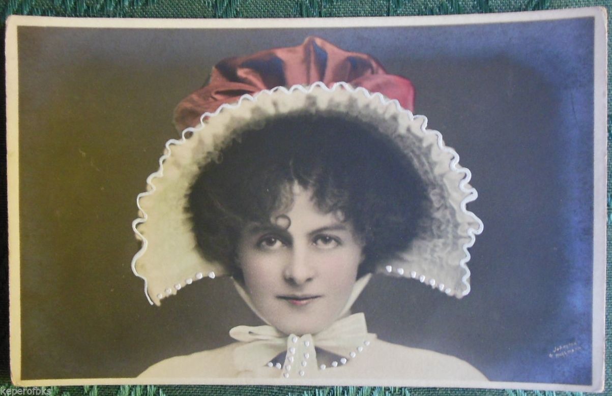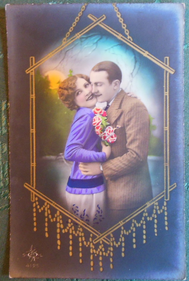 1900-1918 there were post card shops on every corner in the big cities of the USA, UK, Germany and France. Many studio made real photo postcards with pretty ladies were for sale for a penny each, what a bargain. What do you think she was dreaming of? Traveling to a far away land? Chocolates? Or her prince or king?
